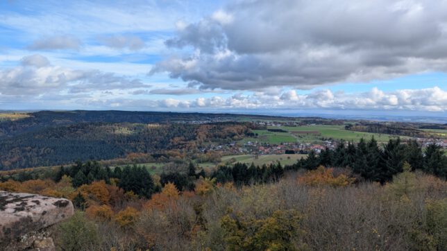 Der Weg führte zunächst bergab, dann wieder hinauf – mit dem Ziel klar vor Augen: der Gipfel des Katzenbuckels mit knapp 627m, dem höchsten Punkt des Odenwalds. Oben angekommen wartete der imposante Katzenbuckelturm, ein 18 Meter hoher Aussichtsturm aus Basaltlava, der einen weiten Rundblick über den Odenwald, den Neckar und bei klarer Sicht sogar bis in die Pfalz ermöglicht. Wir genossen dort oben den herrlichen Ausblick auf das herbstlich gefärbte Blättermeer.